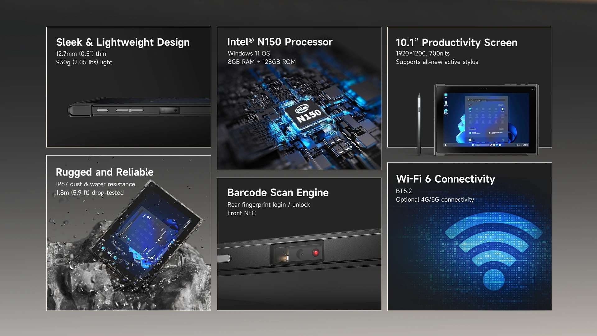 Discover the Intel N150 Laptop, a versatile and powerful device designed for professionals on the move. Running Windows 11 Pro, this laptop ensures top-tier security and productivity with 8GB RAM and a 128GB SSD for seamless multitasking and fast storage. Its vibrant FHD 1200×1920 display with 700 nits brightness delivers crisp visuals, even in bright environments. Stay connected with Wi-Fi 6, Bluetooth, 5G, and GPS, while the M1 2D scanner and NFC reader enable efficient barcode scanning and contactless interactions. Enhanced security features include TPM 2.0 and a fingerprint scanner. The laptop supports the MPP2.0 stylus for precise input, ideal for note-taking or creative tasks. With a 7.74V 4800mAh battery offering up to 7.4 hours of usage, dual USB-C 3.2 ports, a 12-pin PogoPin docking connector, Micro SD, and SIM slots, this device is built for connectivity and convenience. Included accessories—keyboard, adapter, Type-C cable, handstrap, active pen, and leather keyboard—make it a complete package for work and mobility.