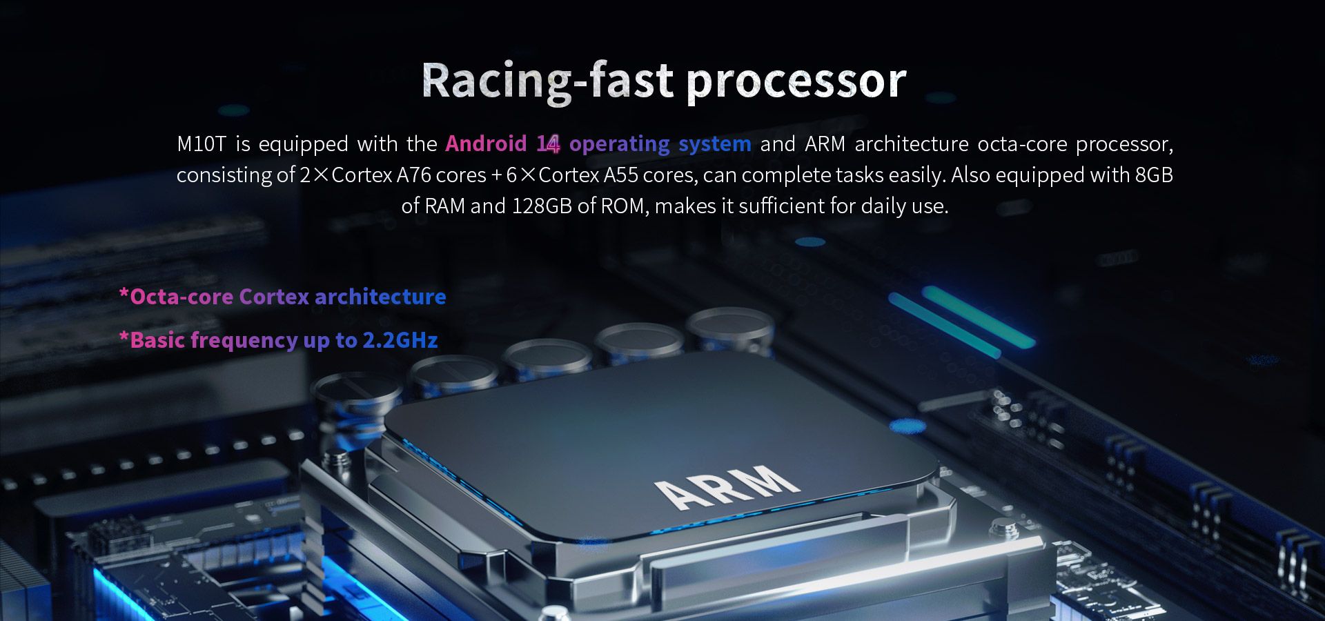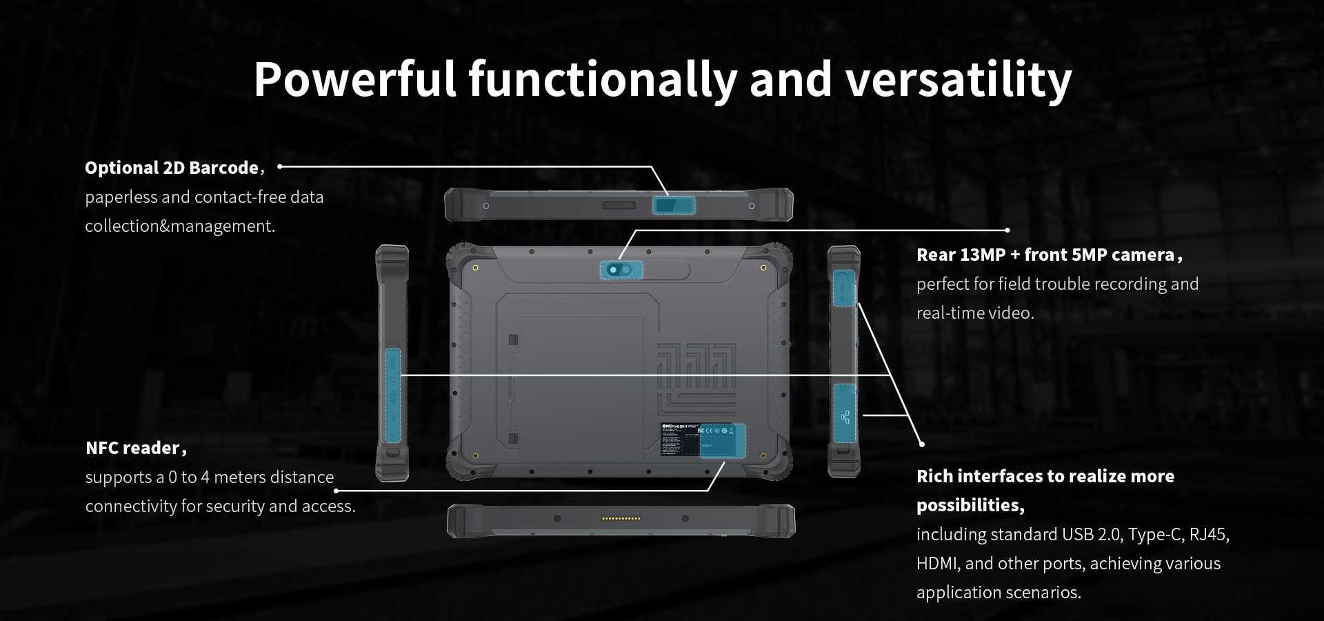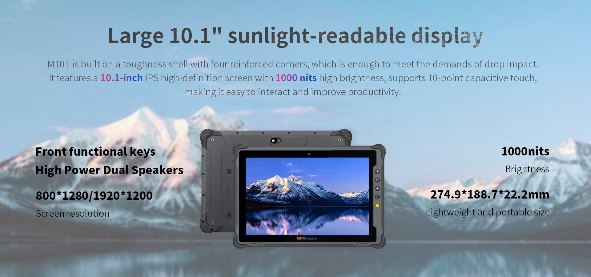 Efficient, Durable, and Professional: Introducing M10T Mobile PC Meet M10T, a rugged and cost-effective 10.1-inch mobile PC that is practical and efficient. Featuring an ARM octa-core processor and Android 14 operating system, this device is equipped with a high-definition and high-brightness screen, detachable large-capacity battery, and 4G/dual-band WiFi/Bluetooth 5.2 communication. The M10T also boasts GPS+Glonass dual-mode positioning, front and rear cameras, and optional 2D barcode scanning engine and NFC module. With its rich interfaces and IP65 dustproof and waterproof MIL-STD-810H design, M10T is versatile enough to be used in various industrial, transportation, energy, manufacturing, and public utility applications.