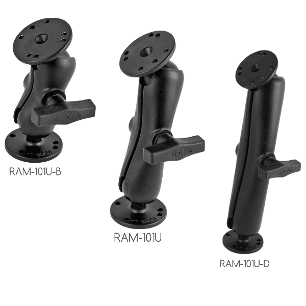 - The RAM-101U-B consists of a short double socket arm and two 2.5\” diameter round bases with the universal AMPS hole pattern. Designed into the mount is a 1.5\” diameter patented rubber ball and socket system with adjustment points at both socket ends of the arm. Rubber ball and socket technology allows for almost infinite adjustment and perfect viewing angles.High quality materials insure your device is safe, secure, and within easy reach. RAM’s patented design also dampens shock and vibration helping to extend the life of your device.